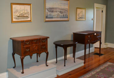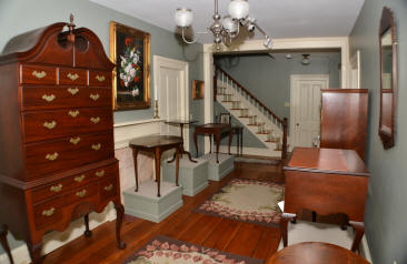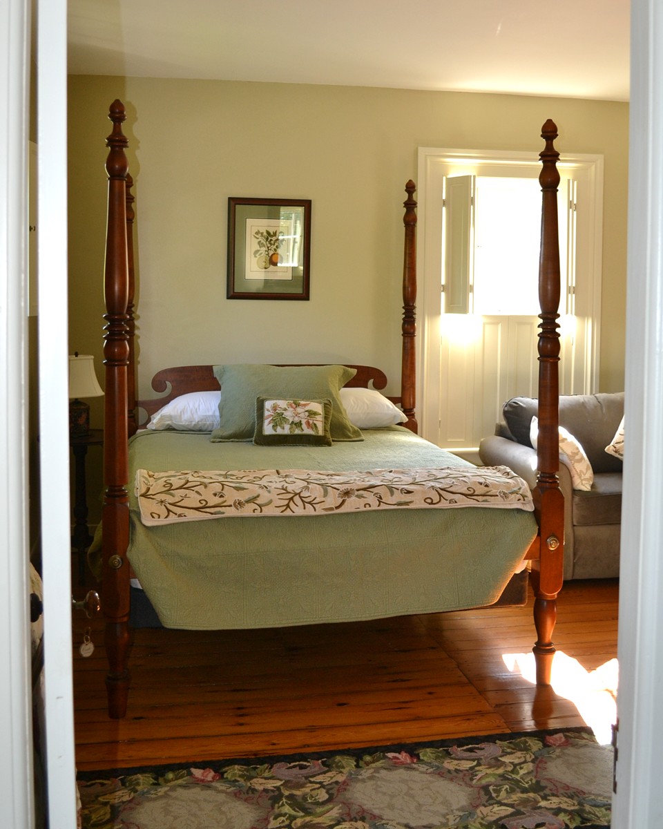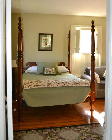 The East Room is shown at left with its circa 1830 maple tall post bed